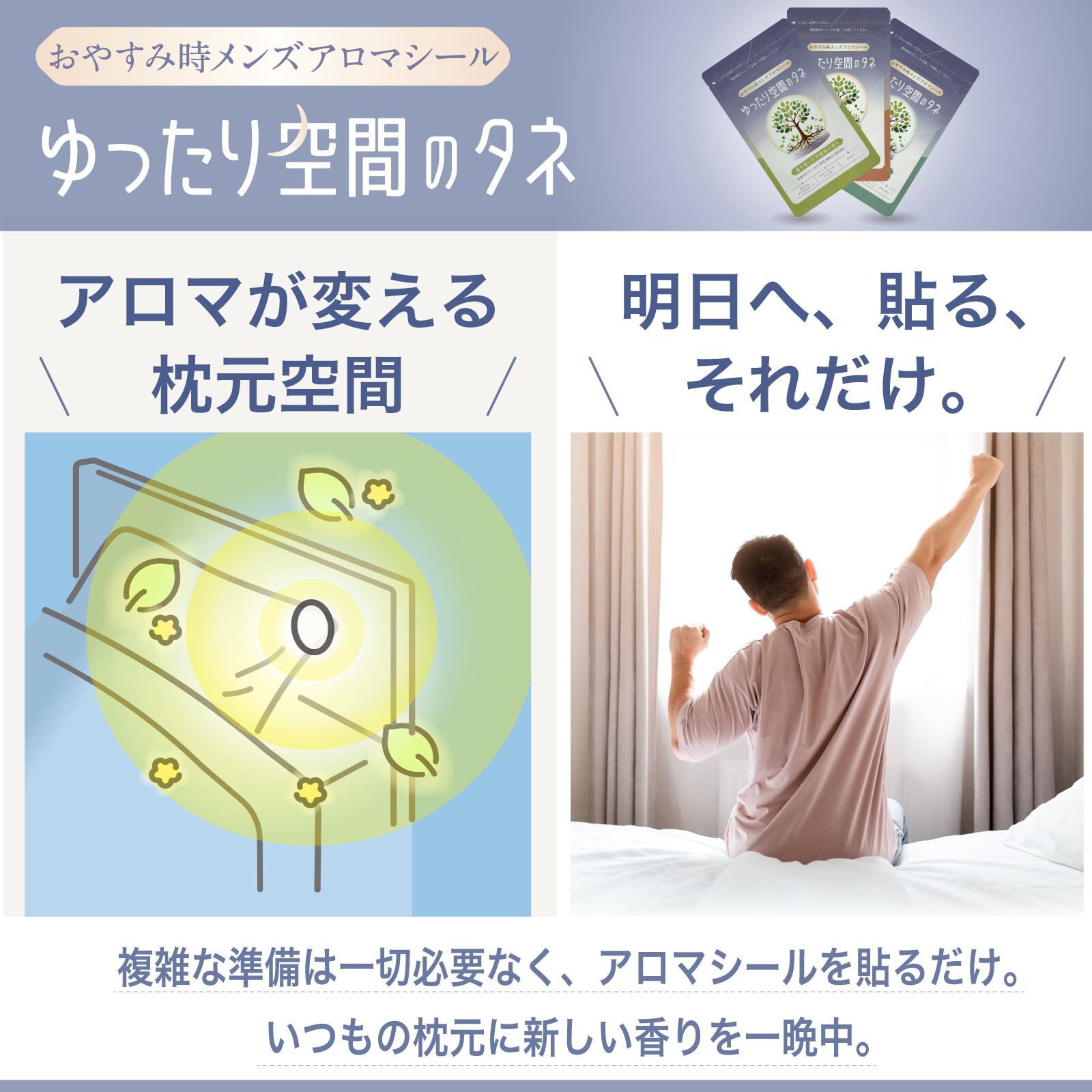 2.アロマが変える、枕元空間:貼るだけでいつもの枕元に新しい香りを。初めてアロマを試してみる方にもお勧め。お部屋全体ではなく、シールから50cm以内を中心に、お休みを邪魔しないほのかな香りが広がります。