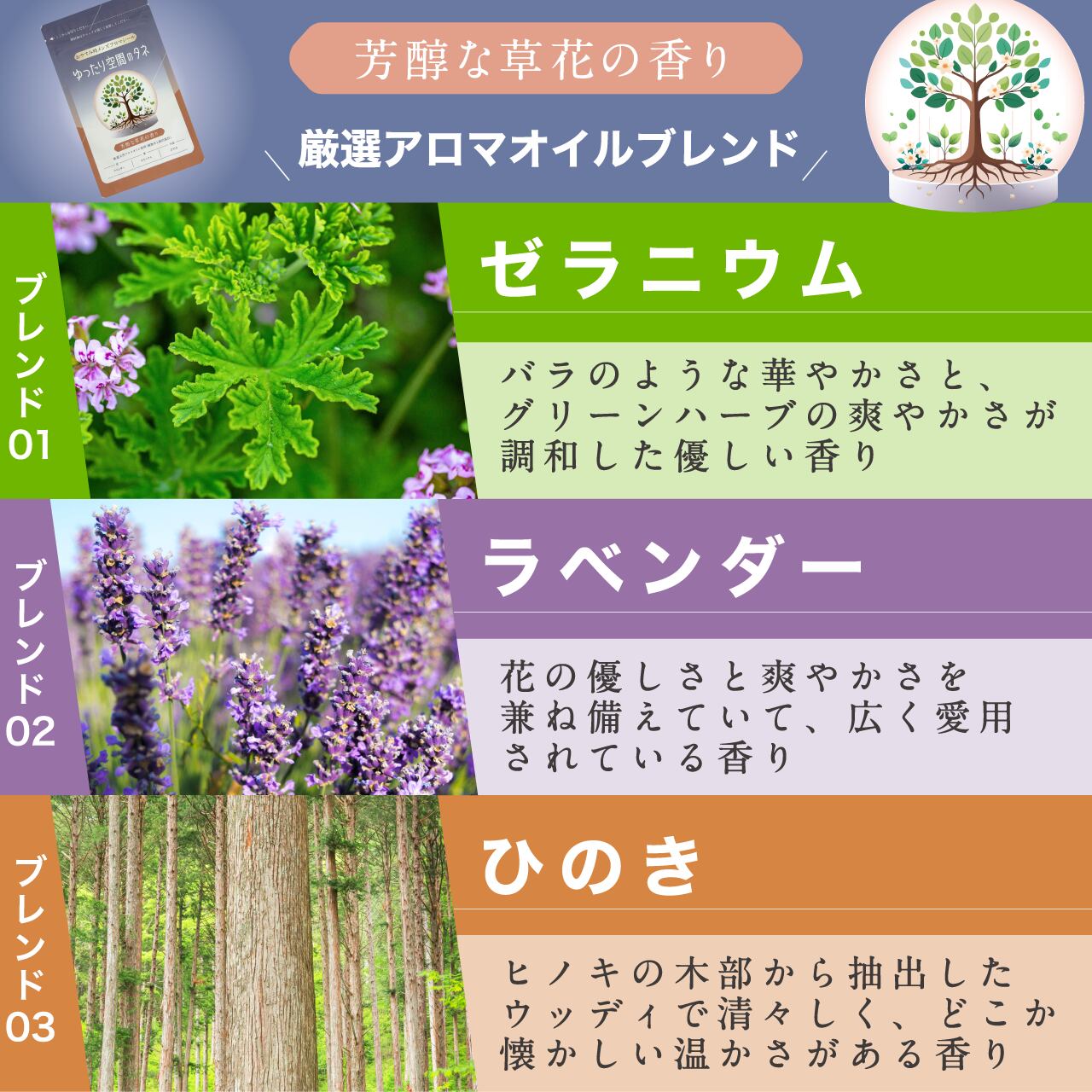 ・芳醇な草花の香り:ラベンダー、ゼラニウム、ひのき