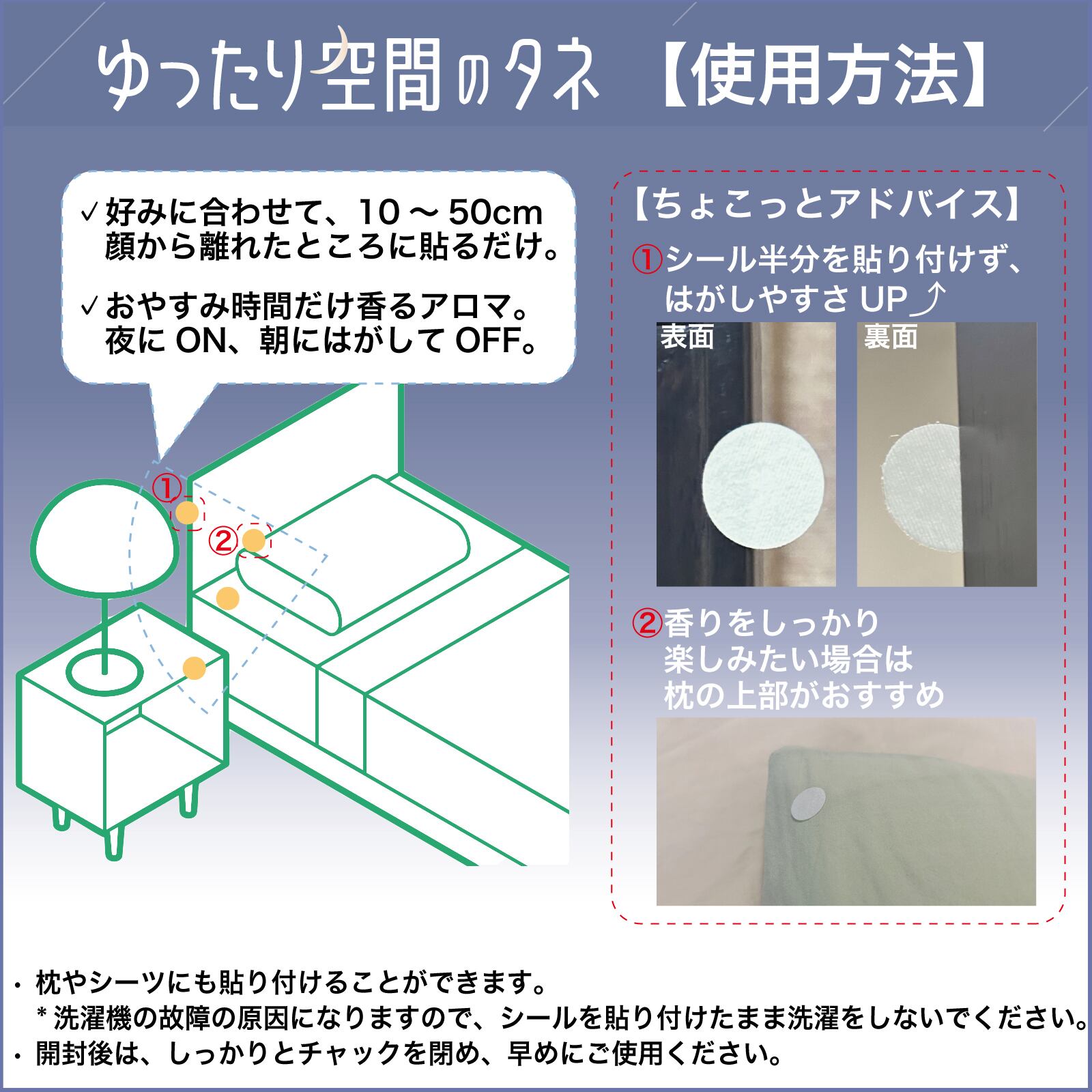 2.アロマが変える、枕元空間:貼るだけでいつもの枕元に新しい香りを。初めてアロマを試してみる方にもお勧め。お部屋全体ではなく、シールから50cm以内を中心に、お休みを邪魔しないほのかな香りが広がります。