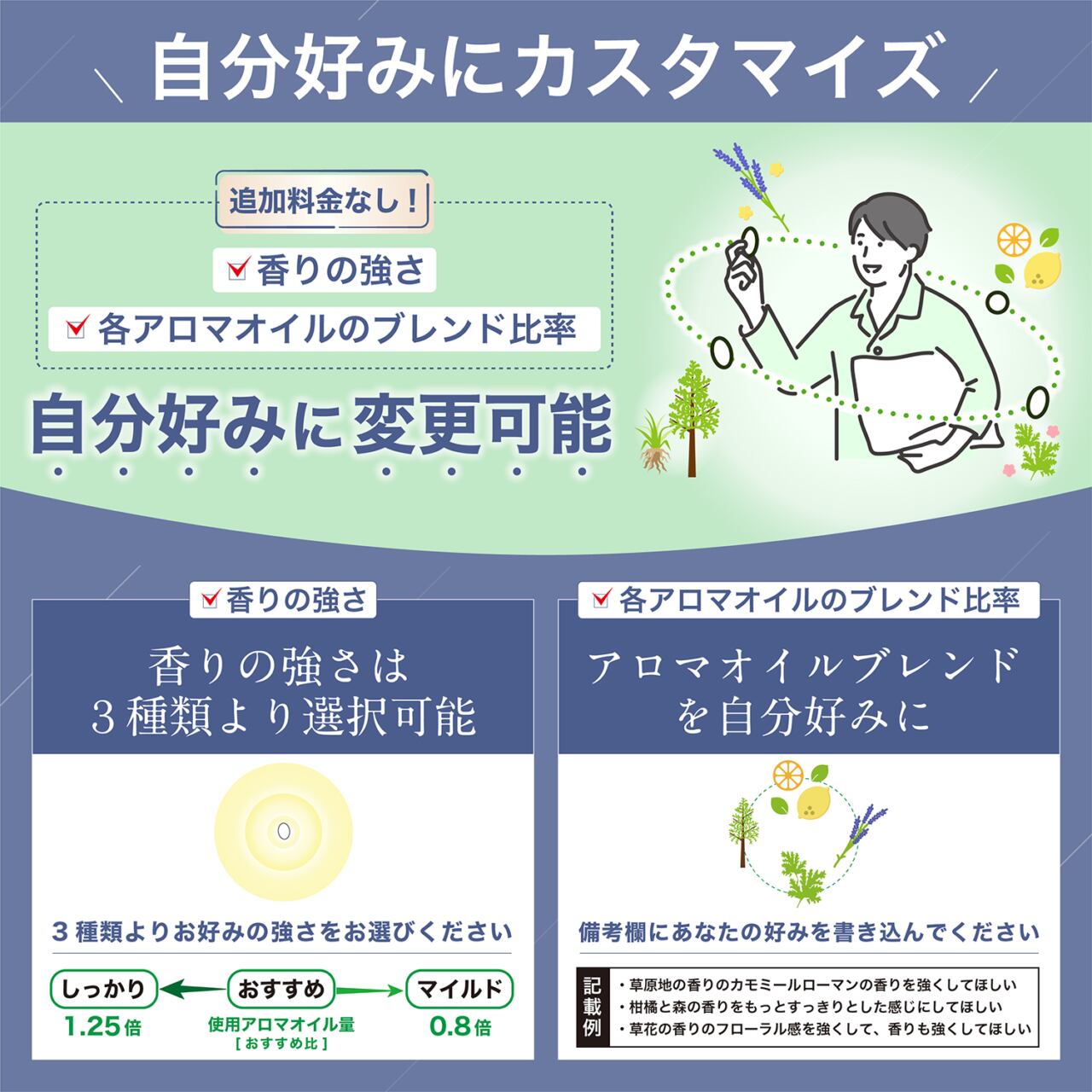 3.自分好みにカスタマイズ:追加料金なしで、香りの強さ・アロマブレンド内容を自分好みに変更可能。