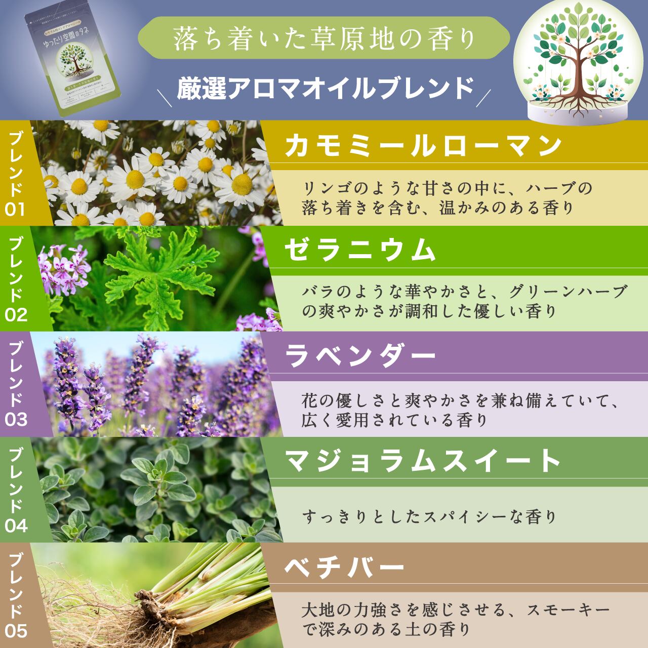 ・落ち着いた草原地の香り:ゼラニウム、マジョラムスイート、カモミールローマン、ラベンダー、ベチバー